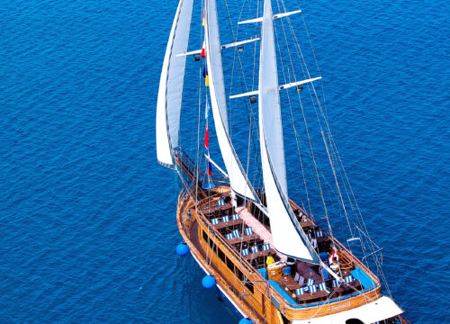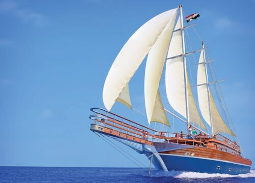 Step aboard one of the most elegant and luxurious sailing vessels on the Red Sea. These twin-masted wooden boats, designed in a classic pirate-ship style, offer an unforgettable blend of comfort, adventure, and atmosphere. Each ship features a spacious upper sun deck perfect for relaxing and sunbathing, along with two lower indoor salons that are fully air-conditioned and beautifully decorated with marble, wood, and pirate-themed details. Your open-buffet lunch is served in the stylish main salon, creating a unique dining experience at sea.